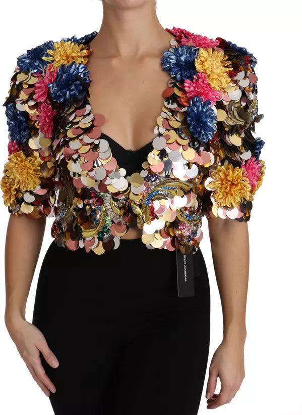 This short jacket is a masterpiece of Italian craftsmanship, adorned with sparkling crystals and sequins forming an enchanting baroque motif.